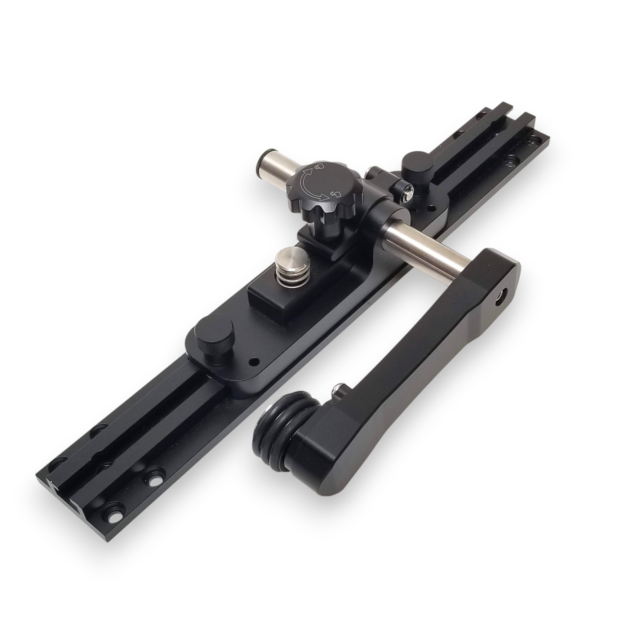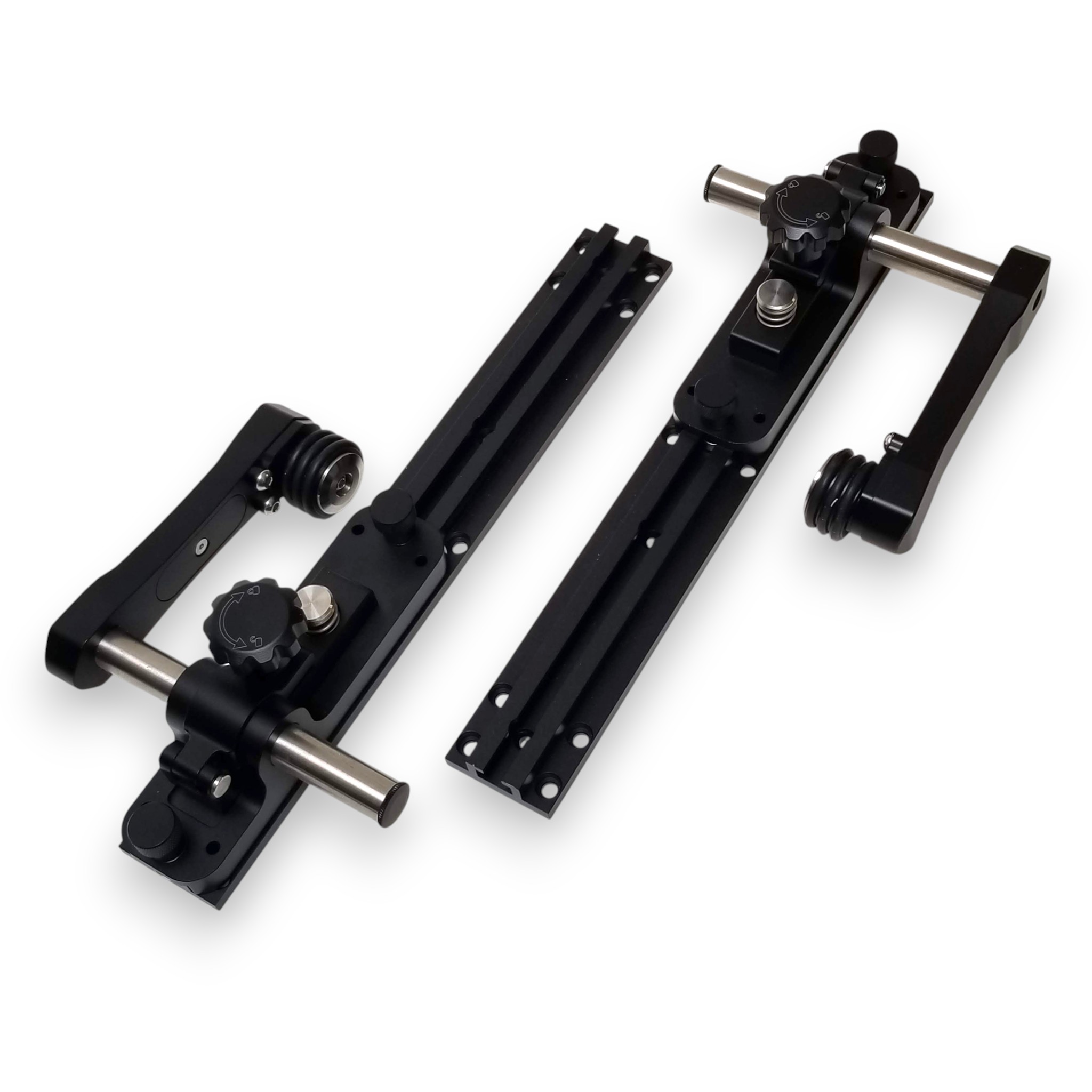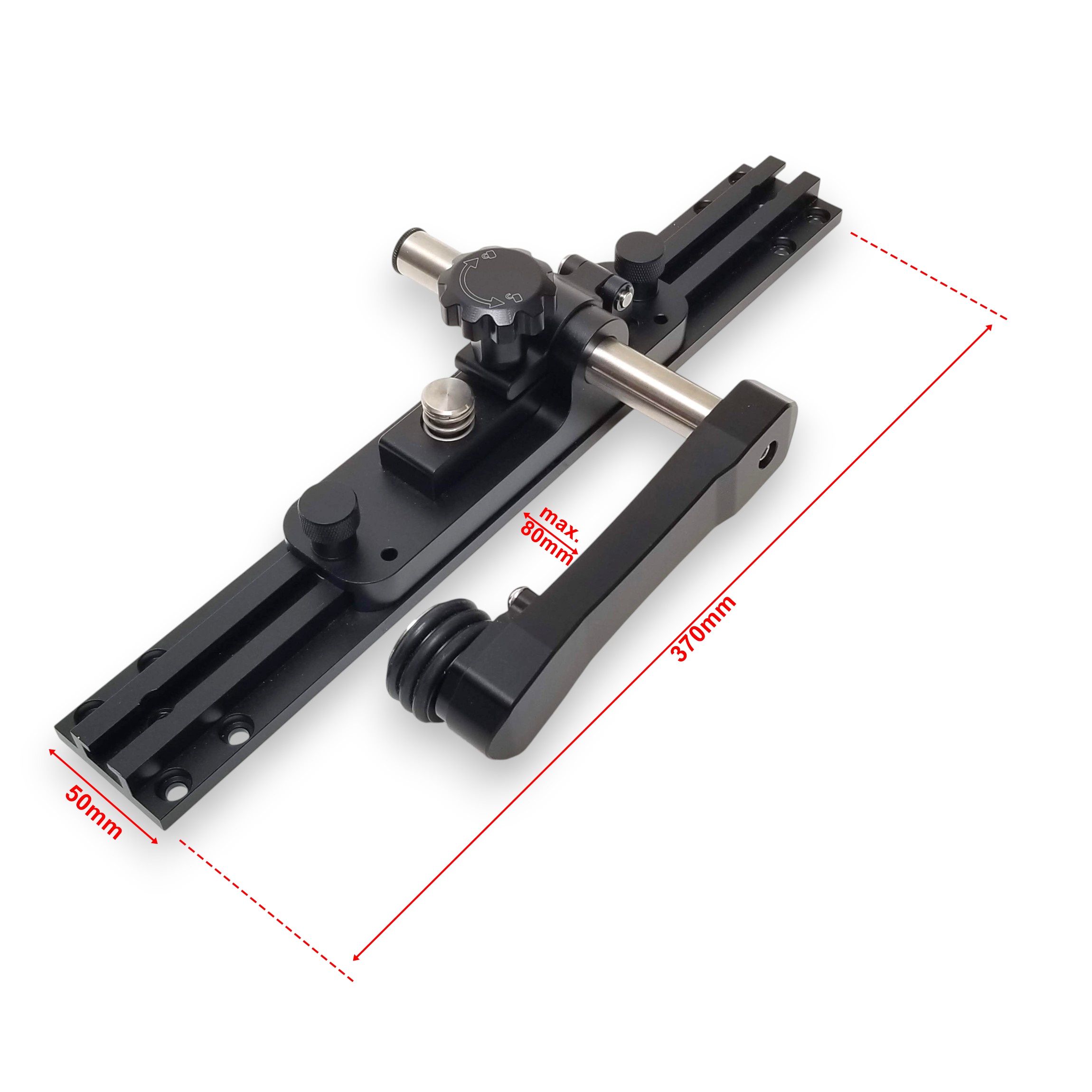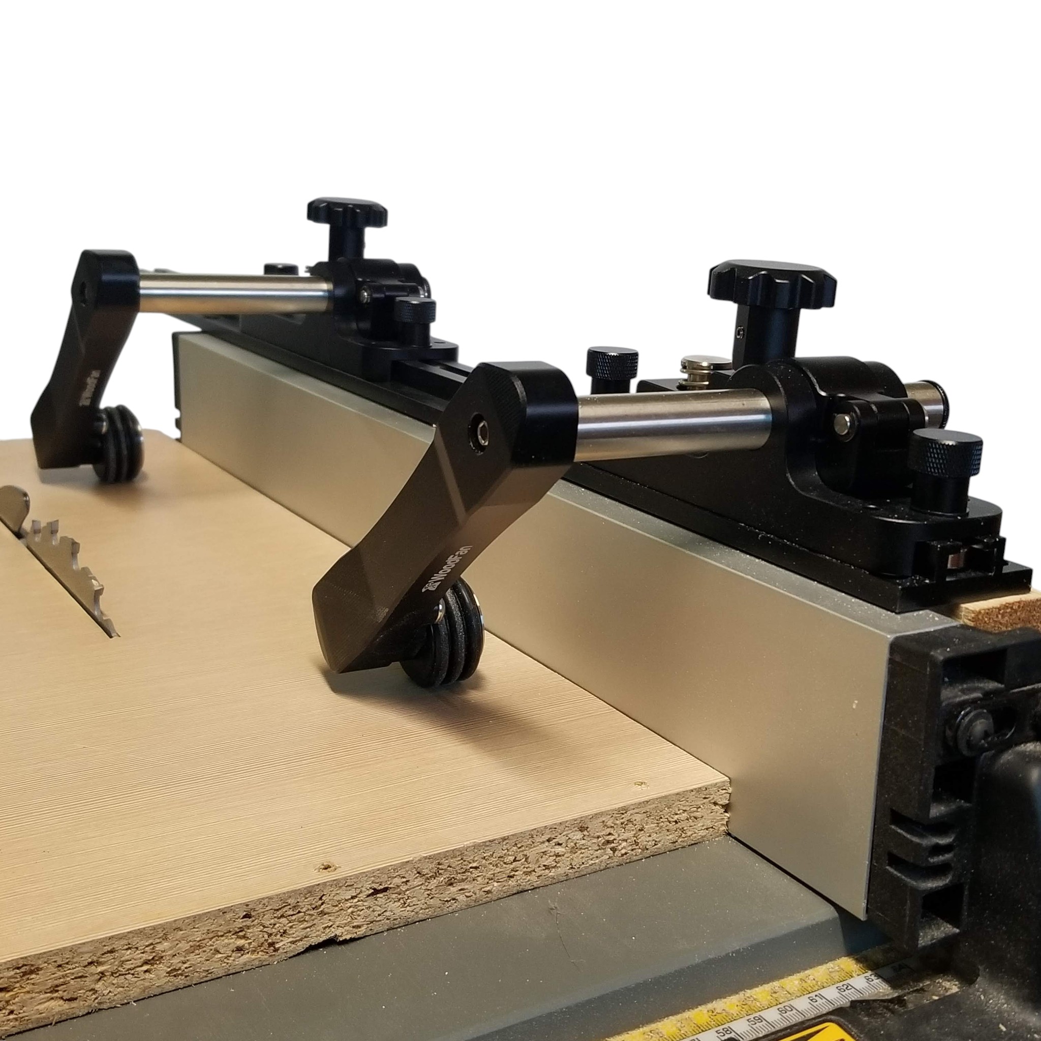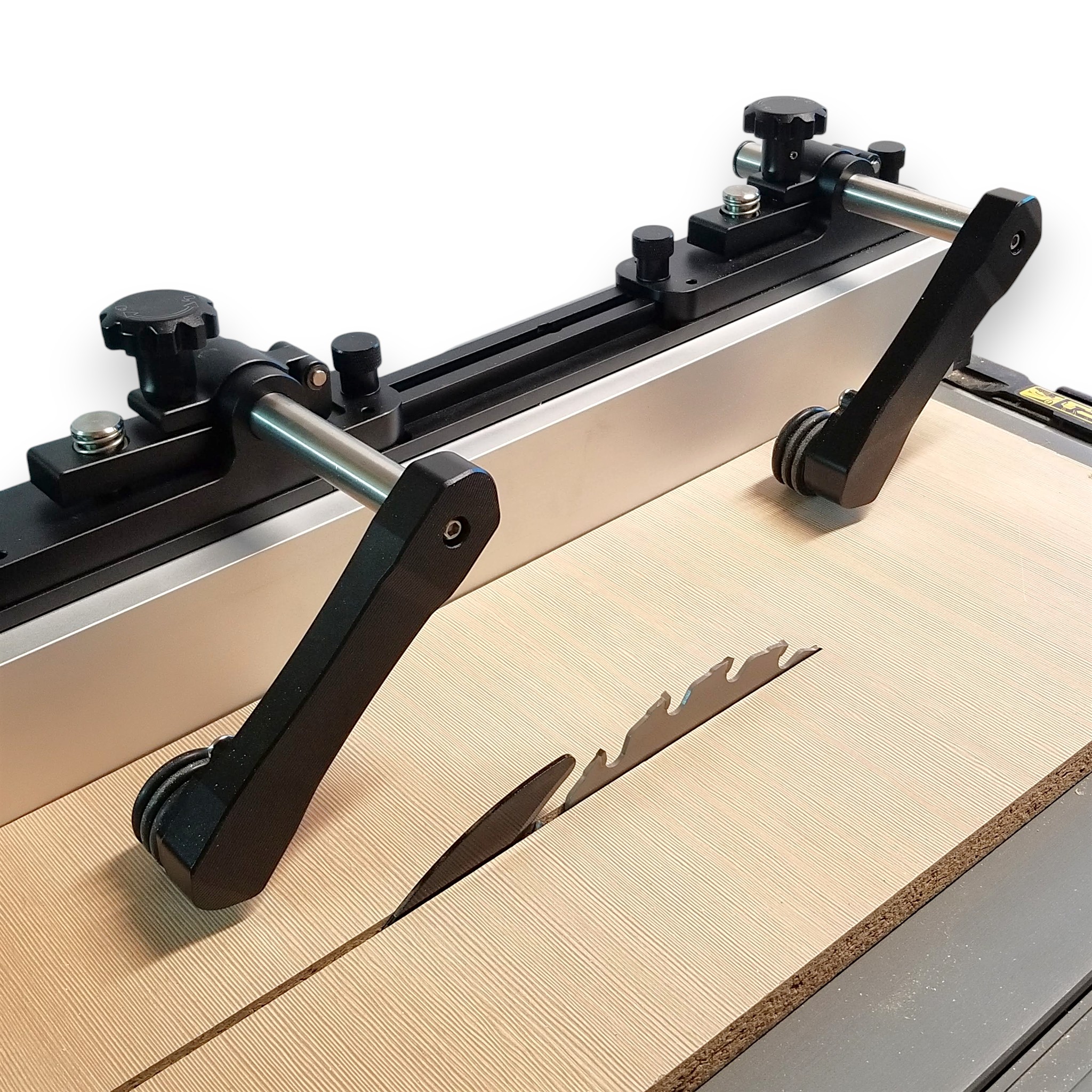 Komplet składa się z dwóch docisków z rolką, osadzonych na dwóch aluminiowych szynach o długości 370mm. Szyny dedykowane są do samodzielnego montażu na prowadnicę piły stołowej. Szyny można montować jedną za drugą (razem tworzą długość 750mm) lub w odległości.