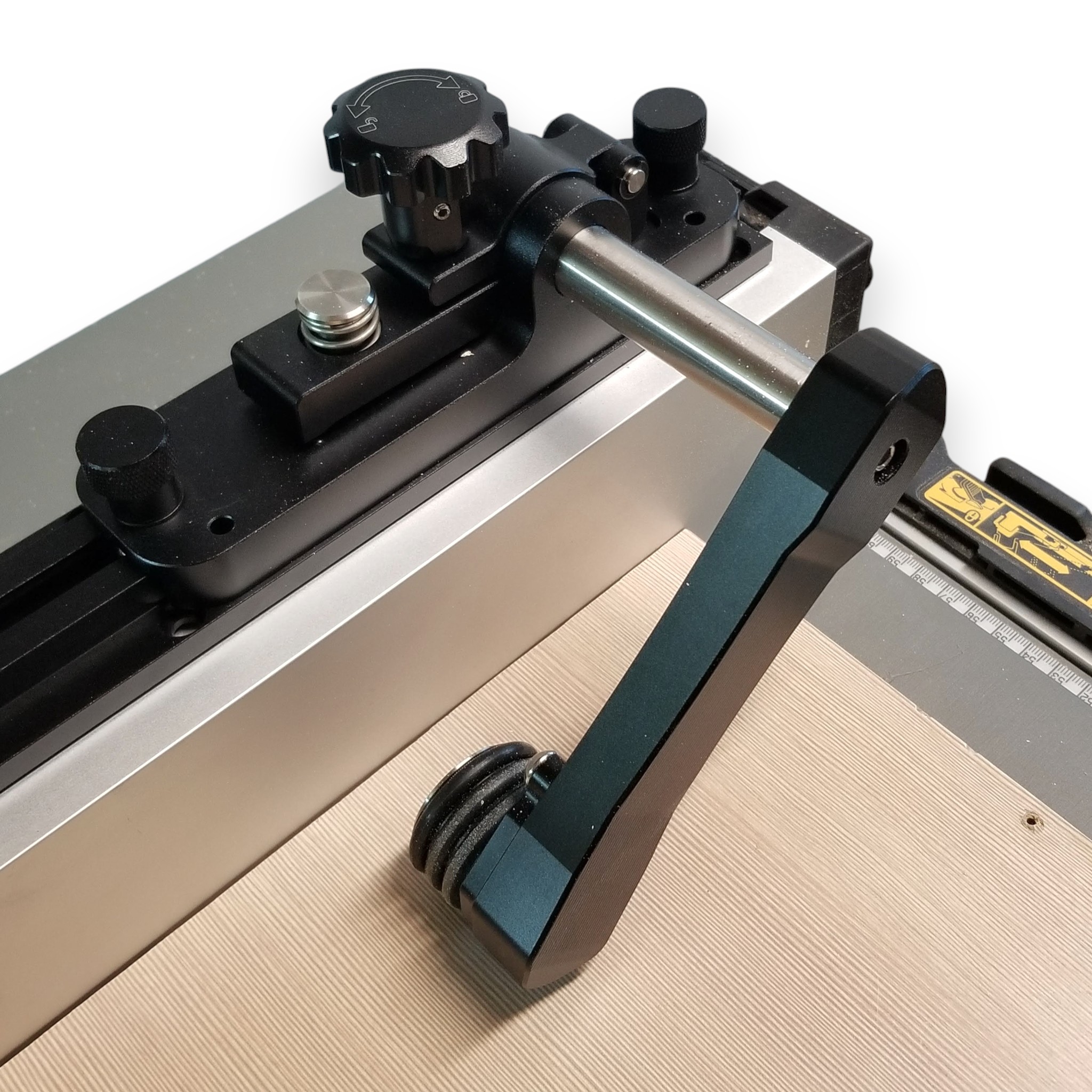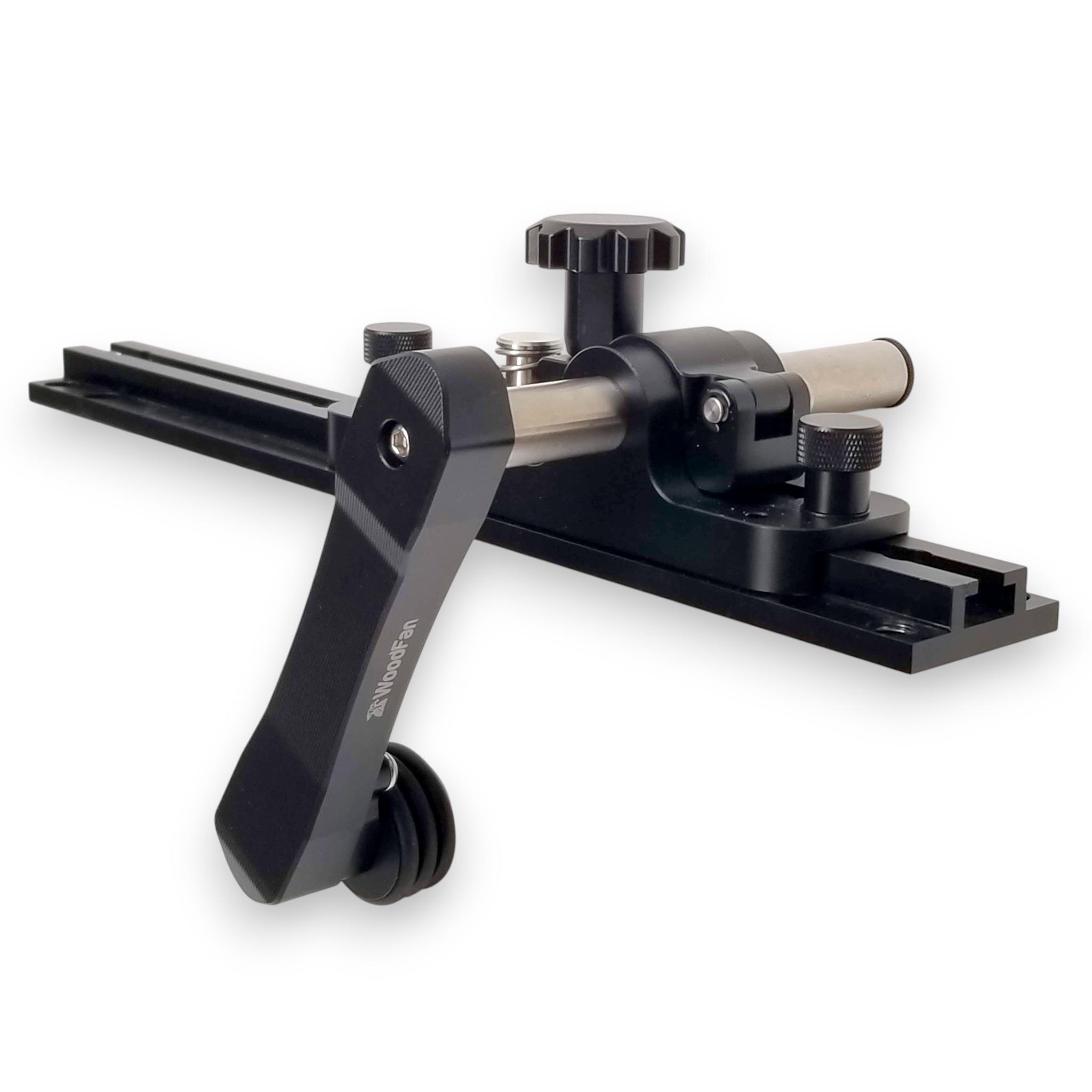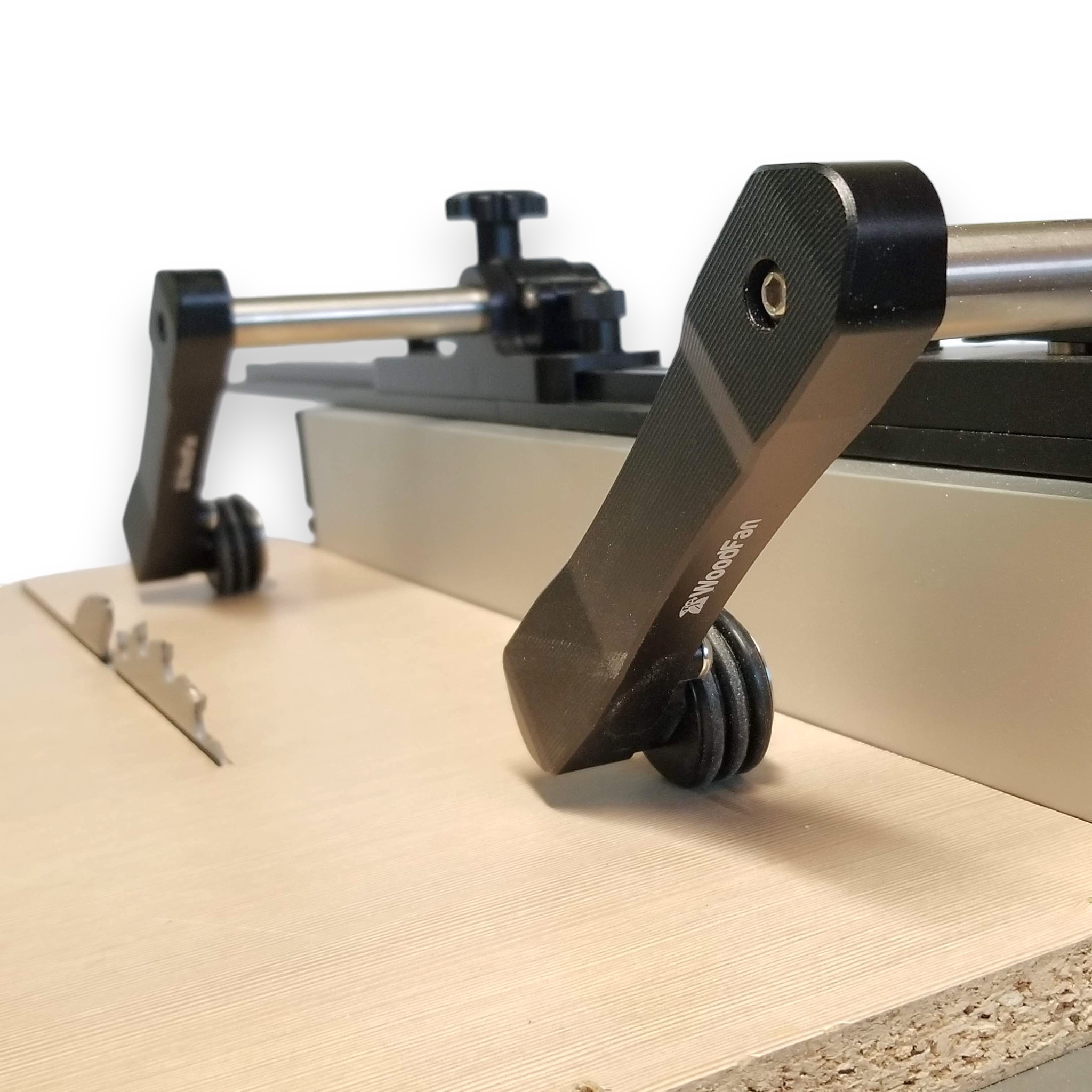 Mechanizm dociskający opiera się na dwóch rolkach ustawionych pod kątem 5°, które dzięki sprężynowemu dociskowi trzymają materiał mocno przy prowadnicy i stole. Specjalne łożyska jednokierunkowe sprawiają, że rolki obracają się tylko w stronę podawania, dzięki czemu nie ma ryzyka odbicia. Położenie rolek na szynie oraz wysięg można swobodnie regulować.