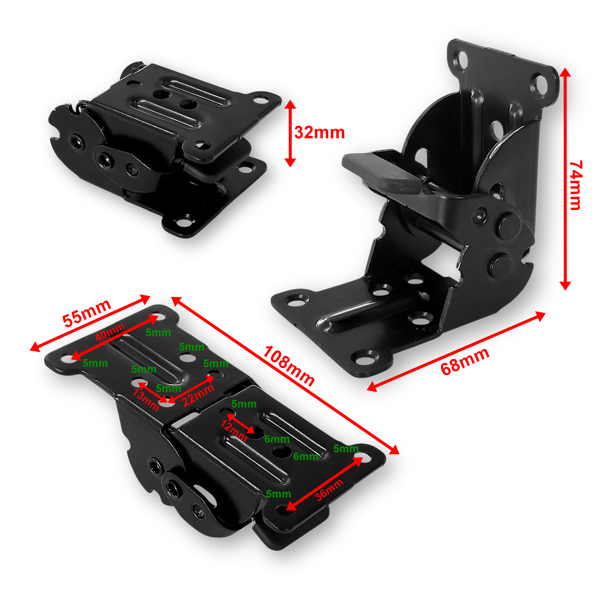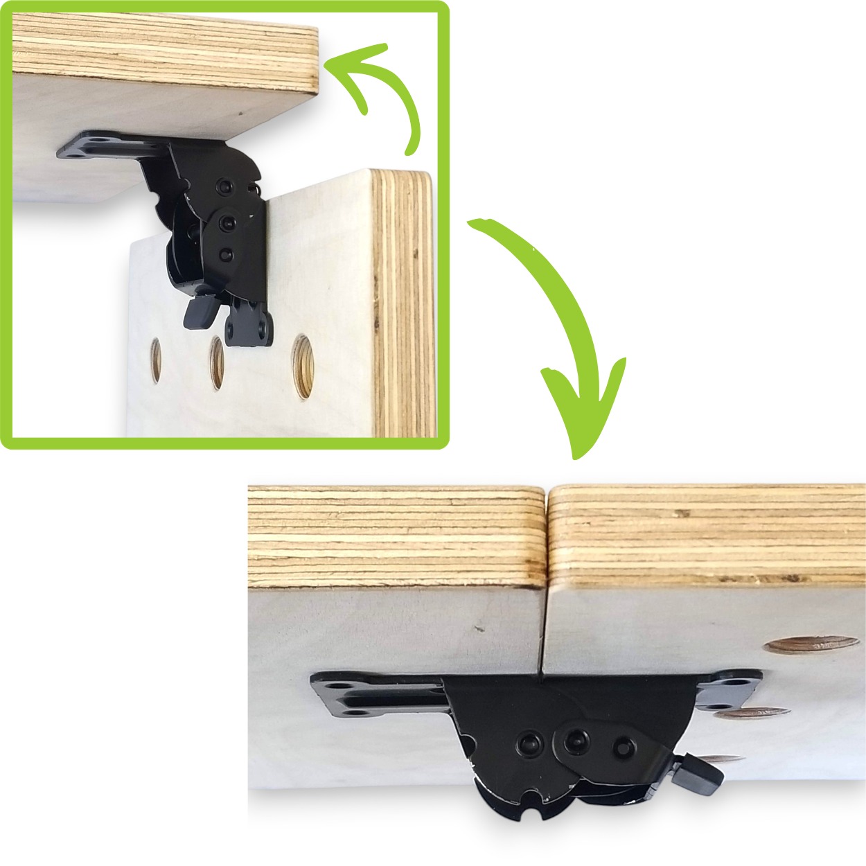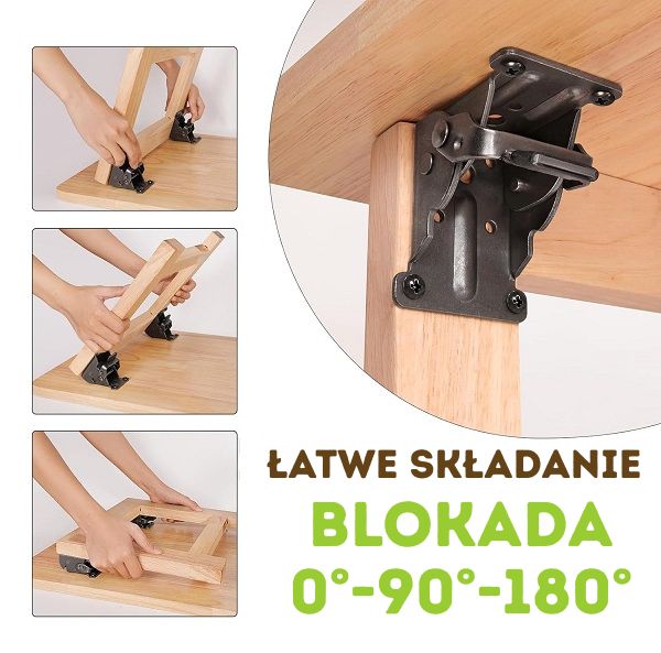 Komplet solidnych, wsporników z trójstopniową blokadą zawiasu do montażu nóg w stołach, biurkach, ławach oraz innych konstrukcjach meblowych wymagających mobilności i oszczędności miejsca. Produkt charakteryzuje się wysoką wytrzymałością oraz precyzyjnym wykonaniem, co gwarantuje stabilność mebli nawet przy dużym obciążeniu.
