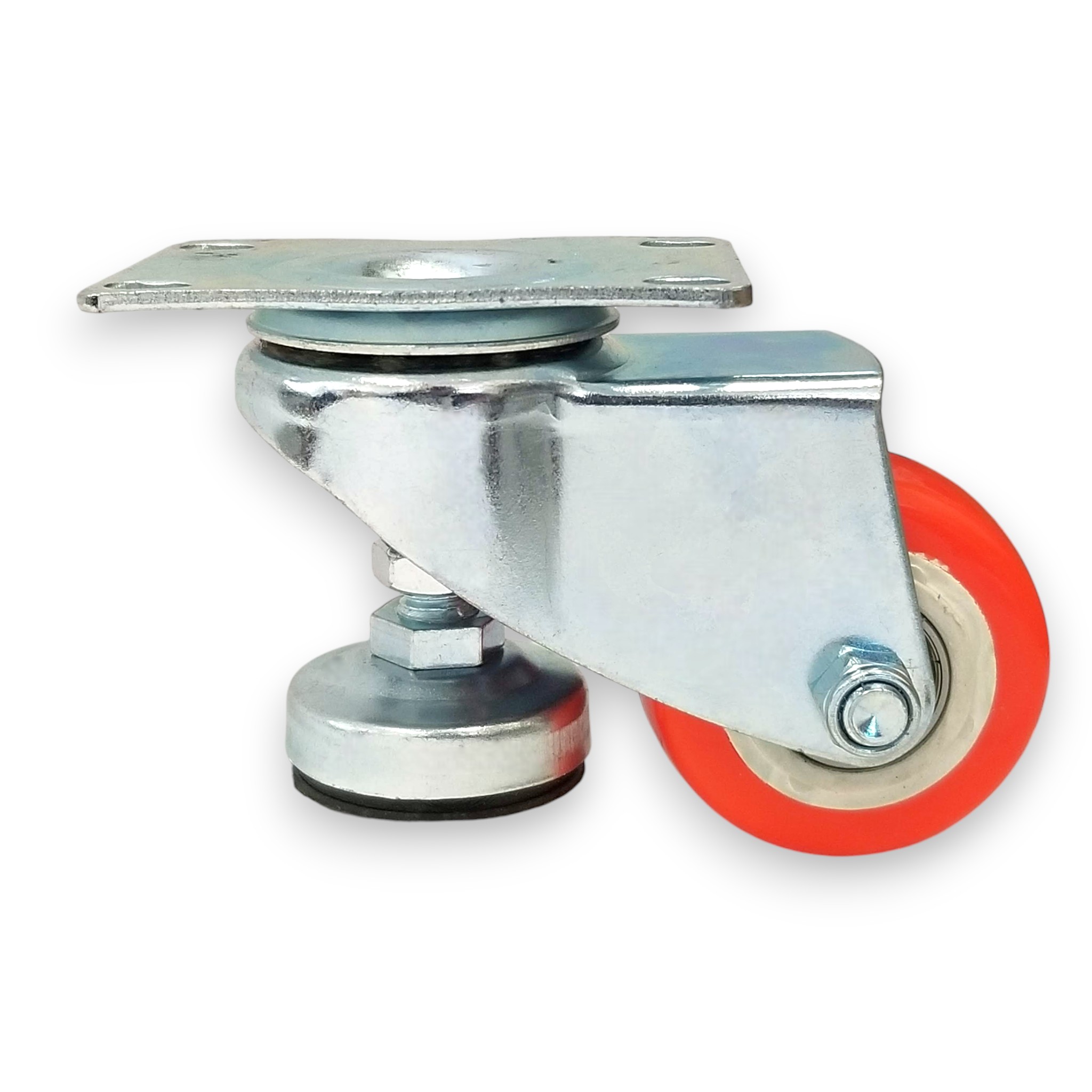 A durable swivel wheel designed for easy maneuvering of heavy and unwieldy equipment. It is perfect for moving furniture, trolleys, workbenches, woodworking machines, and many other pieces of equipment. Thanks to the use of bearing swivel heads, the wheel moves the equipment in any direction. The retractable foot helps to easily level the furniture after it has been moved.
