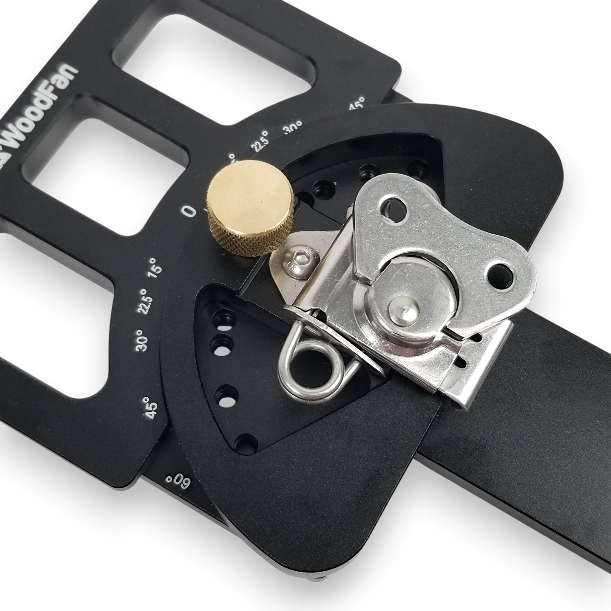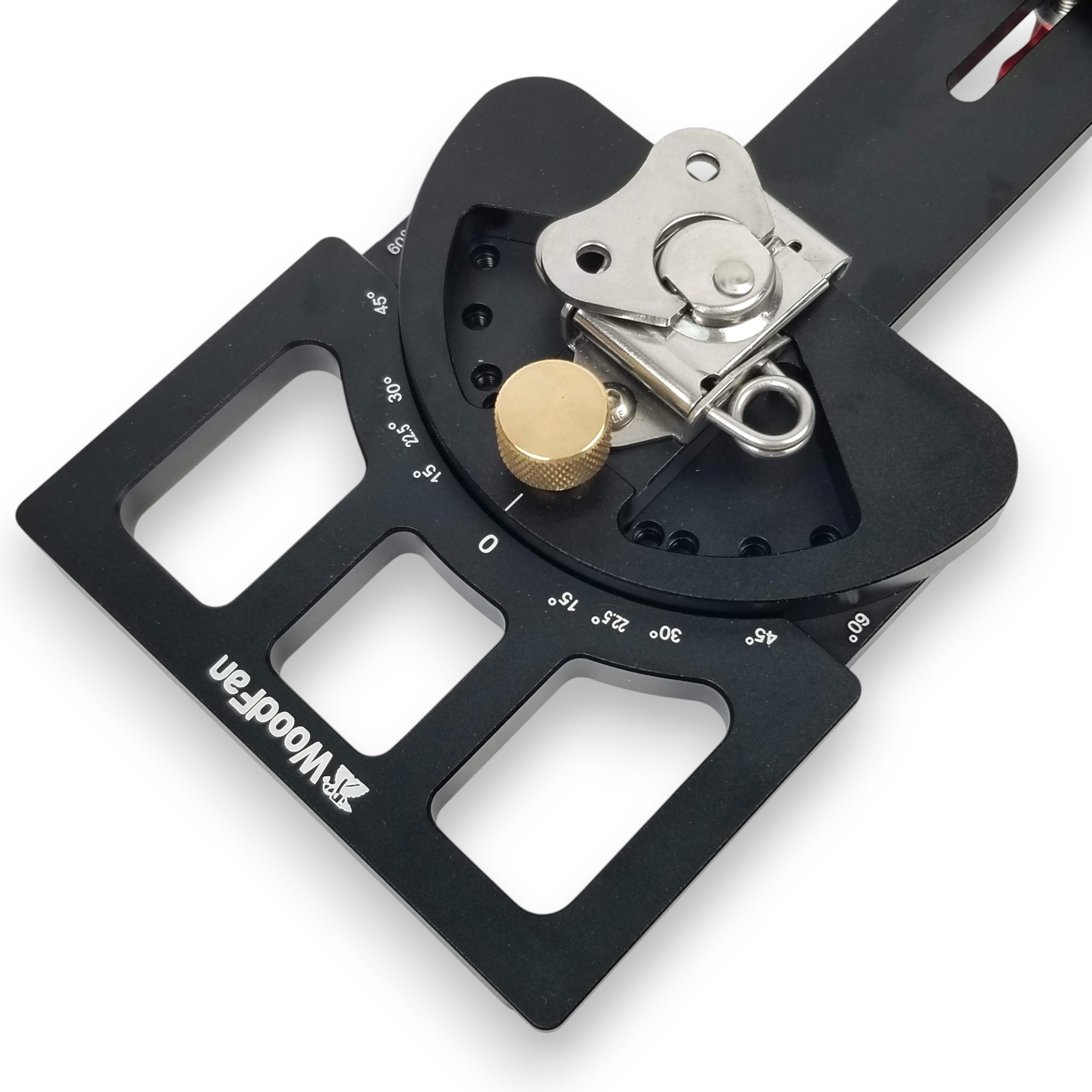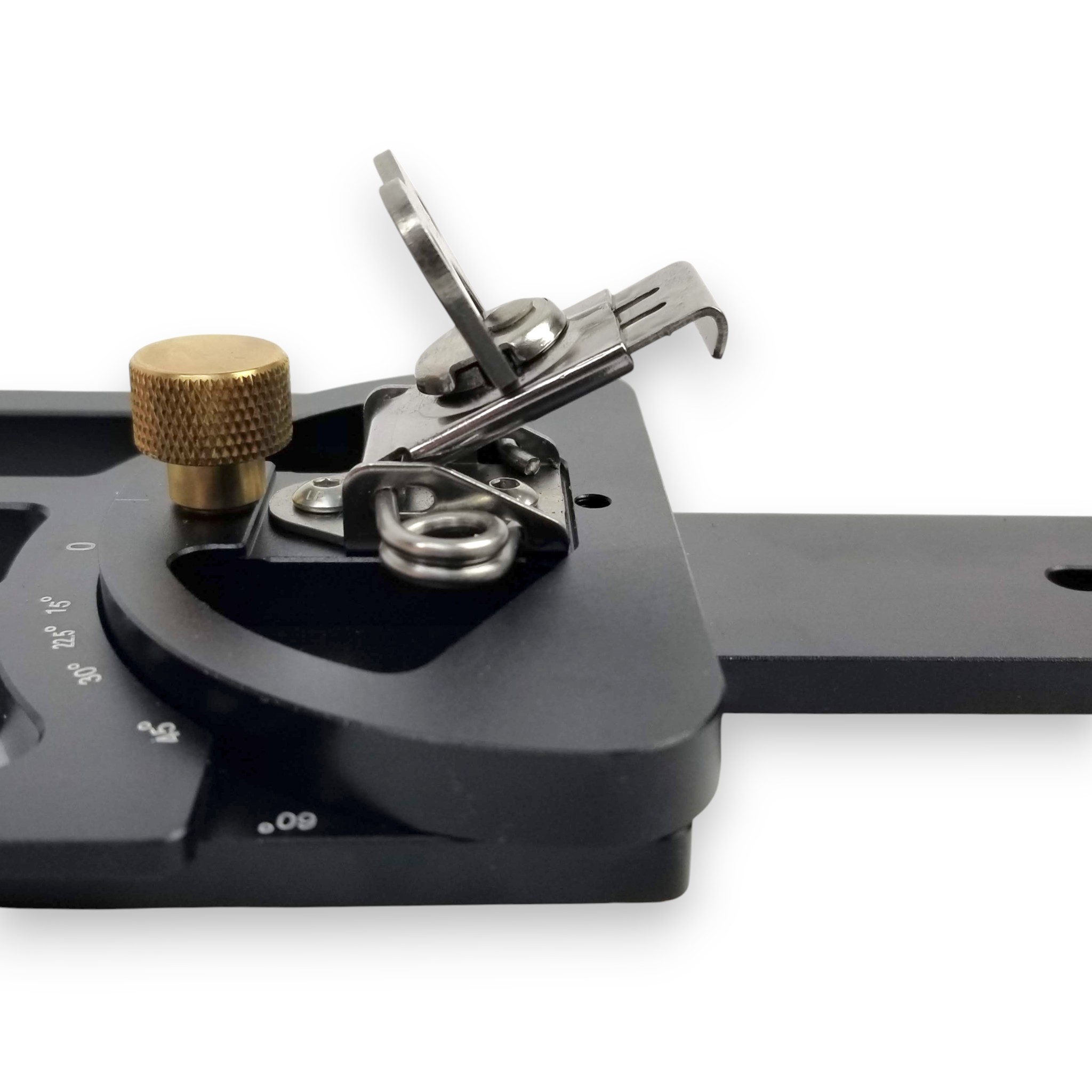 Ustawiamy przykładnicę na wybranym kącie i blokujemy pokrętłem. Akcesorium zaopatrzone jest we wsuwkę, którą umieszcza się w rowku oraz hak chwytający za rant szyny. Obydwa elementy blokuje się dźwigniami.