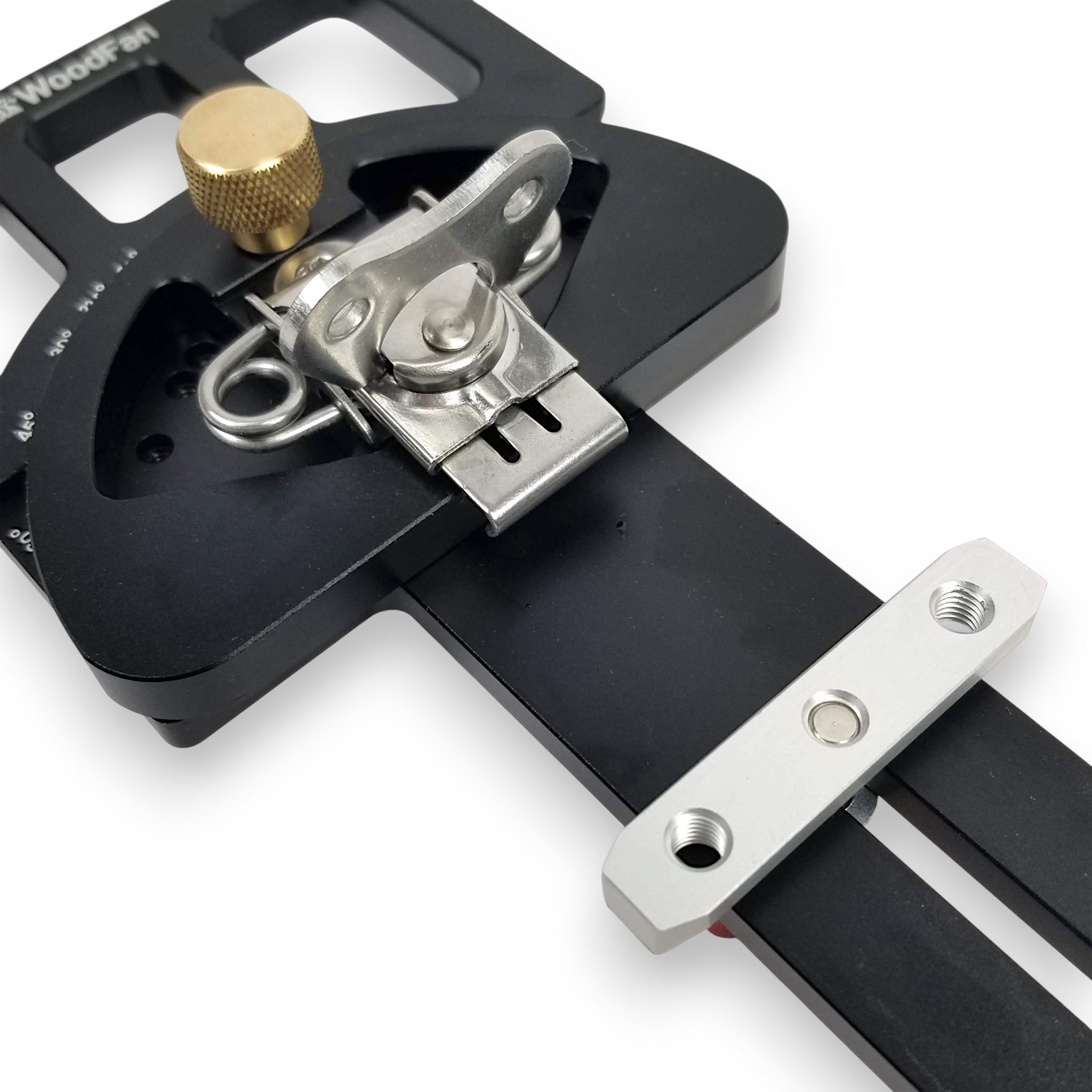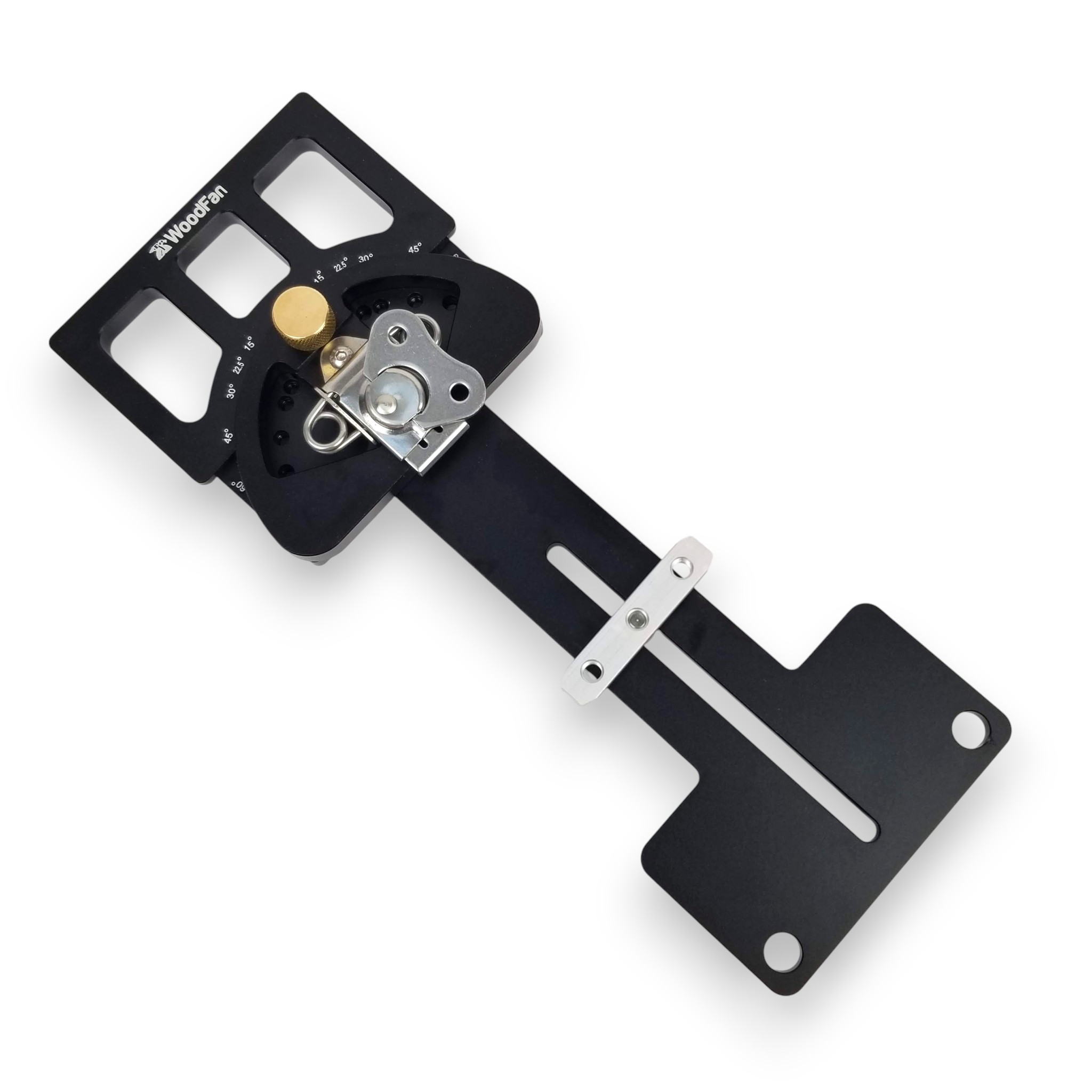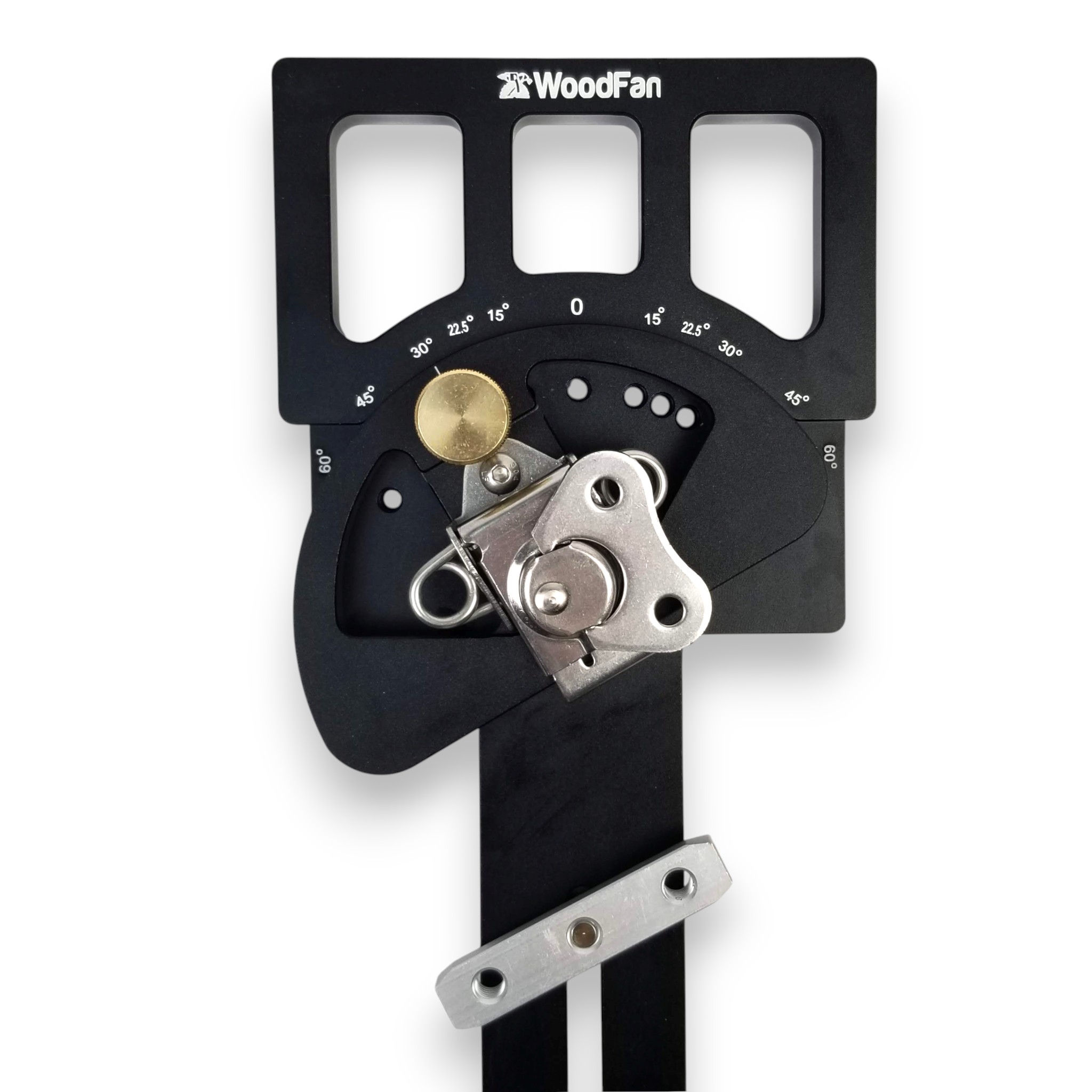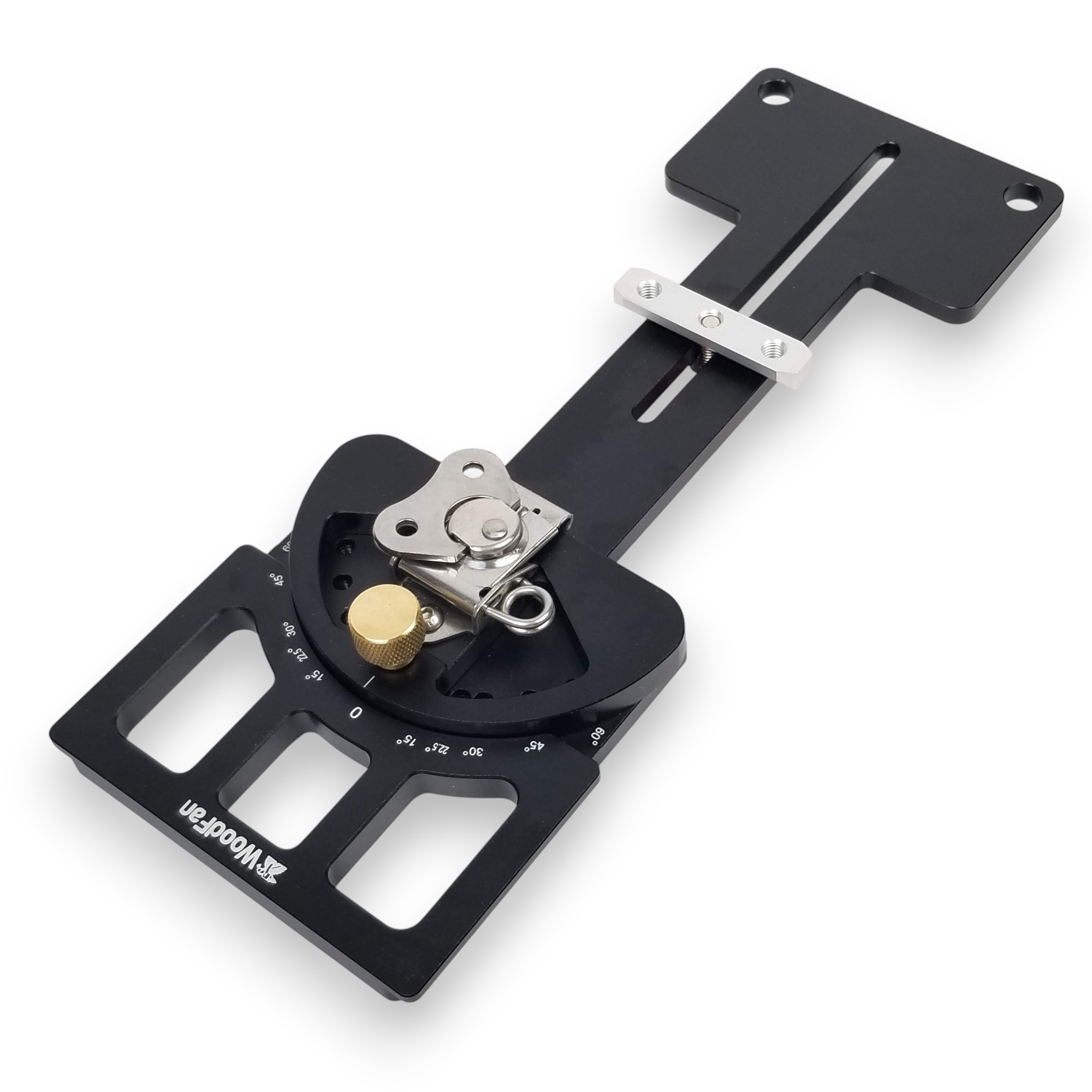 Ustawiamy przykładnicę na wybranym kącie i blokujemy pokrętłem. Akcesorium zaopatrzone jest we wsuwkę, którą umieszcza się w rowku oraz hak chwytający za rant szyny. Obydwa elementy blokuje się dźwigniami.